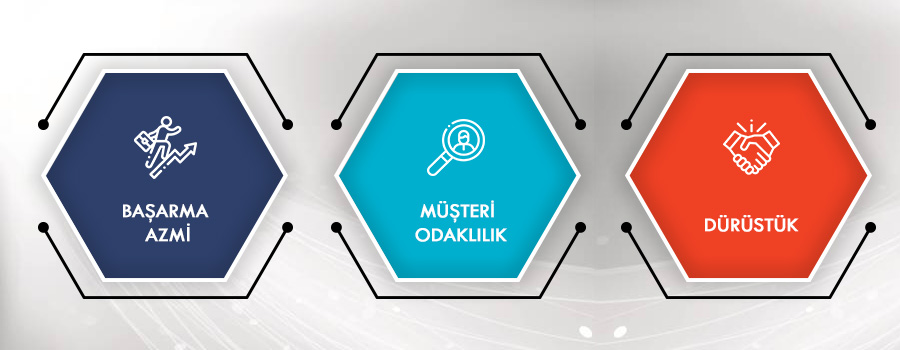 Dürüstlük: Çalışanlarımız, müşterilerimiz ve iş ortaklarımızla ilişkilerimiz şeffaf, uzun süreli, kalıcı ve dürüstlük esasına dayalı yürütülür. Bu yüzden müşterilerimiz bize, bizde müşterilerimize her zaman sonsuz güven duyarız.